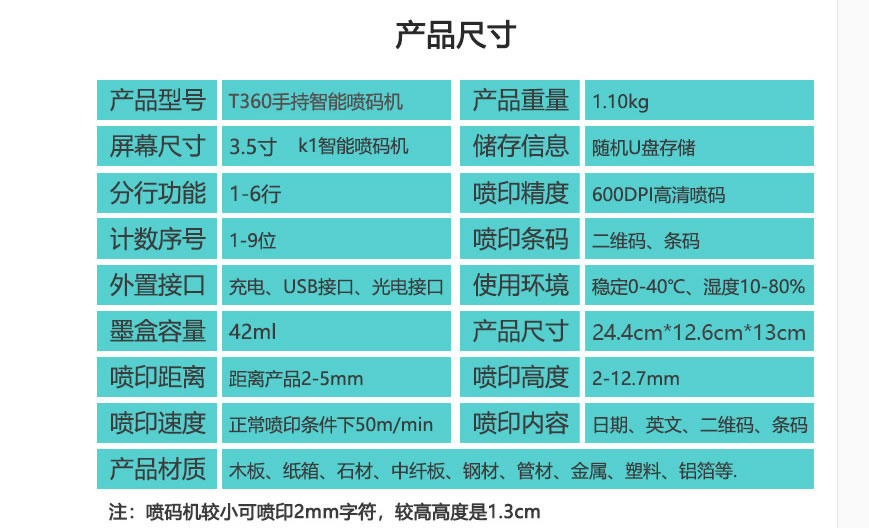 產(chǎn)品特點(diǎn): 1.簡約風(fēng)格,手持更方便。 2.智能噴碼,噴碼效果清晰。 3.噴碼機(jī)新升級,可直接編輯,多種點(diǎn)狀字。 4.大小面積均可噴碼。 5.4.3寸